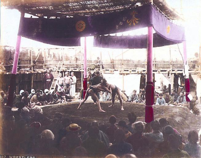 Keywords: Farsari sumo.jpg Wrestlers A sumo match showing rikishi wrestlers a gyōji referee and an audience Japan c 1886 hand-coloured albumen print on a decorated album page by Adolfo Farsari Accessed 14 February 2006 http //www wul waseda ac jp/TENJI/virtual/farsari/index html Waseda University Library; Exhibitions; WEB; Farsari No 37 2006-02 Creator Adolfo Farsari PD-old-100 Black and white photographs of sumo Photographic Views of Japan with Historical and Descriptive Notes Images from the Waseda University Library Hand-colored photographs of Japan Adolfo Farsari 1886 in Japan |