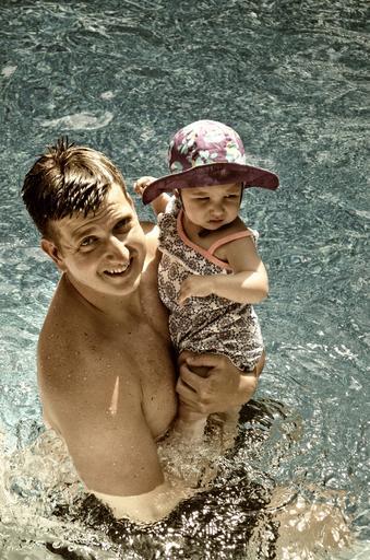 Keywords: father swimming pool toddler pool baby swim water summer smile infant young family carry holding child girl