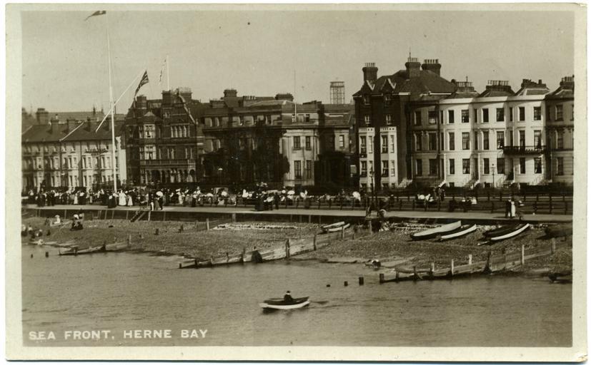 | Keywords: FCP Herne Bay 011.jpg Postcard photo of the sea front at Herne Bay Kent England 1907-1914 The photo was taken from the pier and shows the beach to the east of the pier The photographer was Fred C Palmer of Tower Studio Herne Bay Kent who is believed to have died 1936-1939 The back of the postcard is unused and unpostmarked but it has Palmer's address as Tower Studios Herne Bay where he worked 1907-1922 The women's clothes and presence of many men and hoys small boats run by men suggest a date before 1914 This photo is not as sharply focused as most of Palmer's work so little close detail can be seen Border The remaining border of this image is important for researchers of this photographer Some photographers trimmed their images more than others and Palmer has a reputation for producing smaller postcards than other early 20th century UK photographers He took his own photos developed them in-house onto postcard-backed photographic paper and trimmed them himself It is worth adding that during hand-developing the border is actively masked with equipment which both crops the picture and causes the white frame or border to appear on the paper This frame is part of the design and is one of the reasons why the quality of Palmer's work is so interesting and why there is an article and category for him on English Wiki Researchers need to see exactly where the edge of the postcard is Thank you for taking the time to read this Scan of original postcard in my possession 1907-1914 Fred C Palmer died 1936-1939 out of copyright PD-old-70-1923 Herne Bay Kent Fred C Palmer of Herne Bay |