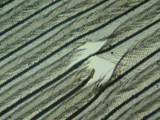 Keywords: Feather hole.jpg en feather hole on a tail feather of barn swallow own Vas Zoltán 2006-11-02 Passeriformes feathers Hirundinidae anatomy Hirundo rustica museum specimens