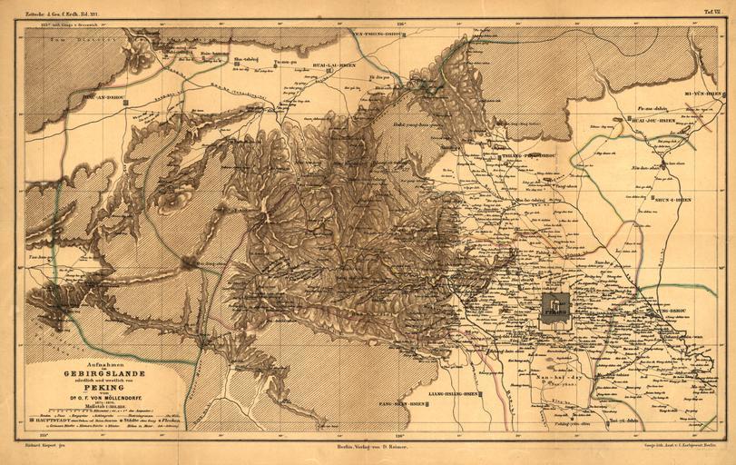 | Keywords: Features of the Mountainous Region North and West of Peking WDL476.png Artwork ru ёллендо ф Отто Ф анц фон 1848-1903 fr Möllendorff Otto Franz von 1848-1903 en Möllendorff Otto Franz von 1848-1903 zh 穆麟德夫 奥托·弗兰兹·冯 1848-1903 pt Möllendorff Otto Franz von 1848-1903 ar موليندورف أوتو فرانز فون 1848-1903 es Möllendorff Otto Franz von 1848-1903 ru Особенности го ного айона к севе у и западу от Пекина fr Caractéristiques de la région montagneuse du Nord et de l'Ouest de Pékin en Features of the Mountainous Region North and West of Peking zh 北京北部和西部山区特征 pt Características das Regiões Serranas Norte e Oeste de Pequim ar ملامح من المنطقة الجبلية الشمالية والغربية من بكين ru Данная ка та составленная Отто Ф анцем фон ёллендо фом 1848-1903 гг была выпущена в качестве одного из двух п иложений к статье ёллендо фа написанной им в 1881 году для жу нала издаваемого емецким геог афическим обществом ёллендо ф был зоологом и сот удником консульства Ге мании Его особенно инте есовали животные севе ного Китая и Цент альной Азии П и составлении данной под обной ка ты кото ая значительно асши ила ка тог афические знания о данном егионе он использовал некото ые уже существующие ка ты в частности ка ты Адми алтейства Великоб итании усского геофизика Ге мана Ф итцше и военного офице а и ученого польско- усского п оисхождения иколая П жевальского а также езультаты собственных исследований и наблюдений Ка та была выполнена немецким ка тог афом Рича дом Кипе том 1846-1915 гг сыном п ославленного геог афа Ген иха Кипе та 1818-1899 гг ёллендо ф п иходился б атом Паулю Гео гу фон ёллендо фу 1847-1901 гг знаменитому ф анцузскому лингвисту и дипломату кото ый состоял советником п и ко оле Ко еи Коджонга и авто у системы латинизации языка манчу <br>Хэбэй Шэн Китай ; ёллендо ф Отто Ф анц фон 1848-1903 гг fr Cette carte réalisée par Otto von Franz Möllendorff 1848-1903 a été initialement publiée au titre d'une des deux annexes à un article de 1881 par Möllendorff dans la revue de la Société Géographique Allemande Möllendorff était un zoologiste et officier consulaire allemand dont l'intérêt principal était les animaux de la Chine du nord et de l'Asie centrale Il a utilisé plusieurs cartes existantes telles que celles de l'Amirauté britannique du géophysicien russe Hermann Fritsche et celles de l'officier militaire et scientifique russo-polonais Nikolai Przewalski ainsi que ses propres relevés et observations pour produire cette carte très détaillée qui a considérablement amélioré la connaissance cartographique de la région La carte a été gravée par le cartographe allemand Richard Kiepert 1846-1915 fils du célèbre géographe Heinrich Kiepert 1818-99 Möllendorff était le frère de Paul Georg von Möllendorff 1847-1901 célèbre linguiste et diplomate allemand qui fut un conseiller du roi Kojong de Corée et l'auteur d'un système de romanisation de la langue mandchoue <br>Hebei Sheng Chine ; Möllendorff Otto Franz von 1848-1903 en This map by Otto Franz von Möllendorff 1848-1903 originally was published as one of two appendixes to an 1881 article by Möllendorff in the journal of the German Geographical Society Möllendorff was a zoologist and German consular official whose primary interest was the animals of northern China and Central Asia He used a number of existing maps such as those by the British Admiralty the Russian geophysicist Hermann Fritsche and the Polish-Russian military officer and scientist Nikolai Przewalski as well as his own surveys and observations to produce this highly detailed map one that greatly expanded cartographic knowledge of the region The map was engraved by the German cartographer Richard Kiepert 1846-1915 the son of the famed geographer Heinrich Kiepert 1818-99 Möllendorff was the brother of Paul Georg von Möllendorff 1847-1901 a famous German linguist and diplomat who was an adviser to the Korean king Kojong and the author of a system for romanizing the Manchu language <br>Hebei Sheng China ; Möllendorff Otto Franz von 1848-1903 zh 这幅由奥托·弗兰兹·冯·穆麟德夫(1848-1903年)绘制的 图 是 为穆麟德夫1881年 德国 理学会会刊上发表文章的两份附录之 出版的 穆麟德夫是 位动物学家兼德国领事官员,其主要对中国北部和中亚 区的动物感兴趣 他使用了很多当时已 的 图,例如英国海军部 俄罗斯 球物理学家赫尔曼·弗里切以及波兰-俄罗斯军官兼科学家尼古拉·普瓦热尔斯基 绘制的 图,他还运用了很多自己的调查和观察成 ,制 了这幅 常详细的 图 这幅 图极大 丰富了 关该 区的制图知识 该 图由德国制图师理查德·基佩尔特(1846-1915年)刻版,他是著名 理学家海因里希·基佩尔特(1818-99年)的儿子 穆麟德夫是 罗·乔治·冯·穆麟德夫(1847-1901年)的弟弟, 罗·乔治·冯·穆麟德夫是 位德国著名的语 学家兼外交家,是 高宗