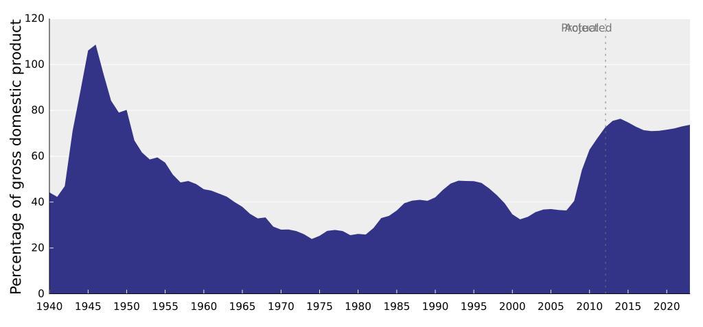 Keywords: FederalDebt1940to2012.svg en Federal Debt Held by the Public as a percentage of gross domestic product from 1940 to 2012 projected until 2023 2013-05-16 14 03 55 Updated Budget Projections Fiscal Years 2013 to 2023 https //www cbo gov/sites/default/files/cbofiles/attachments/44172-Baseline2 pdf PDF page 9 figure 2 Congressional Budget Office PD-USGov Debt-to-GDP ratio of the United States Debt in the United States Government debt-to-GDP ratio of the United States United States in the 20th century United States in the 21st century |