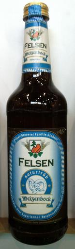Keywords: Felsen Weizenbock.jpg en A bottle of Felsen Weizenbock beer own Miguel Andrade 2014-01-26 Brown bottles Beers of Bavaria Cc-zero