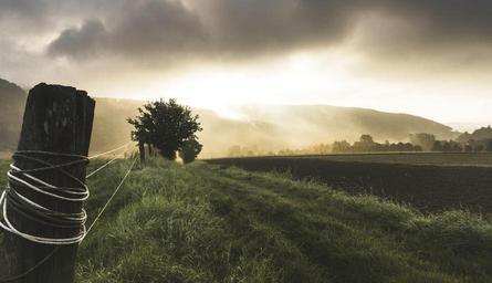 Keywords: fence rural field farm countryside sunlight scenic tree country agriculture grass meadow rustic landscape wire post pole perspective hills way path