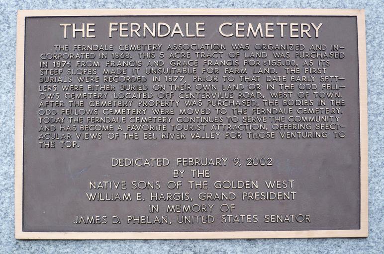 Keywords: Ferndale CA Ferndale Cemetery NSGW.jpg en The Ferndale Cemetery The Ferndale Cemetery Association was organized and incorporated in 1868 This 5 acre tract of land was purchased in 1876 from Francis and Grace Francis for 155 00 as its steep slopes made it unsuitable for farm land The first burials were recorded in 1877 prior to that date early settlers were either buried on their own land or in the odd fellows cemetery located off Centerville Road west of town After the cemetery property was purchased the bodies in the Odd Fellows Cemetery were moved to the Ferndale Cemetery Today the Ferndale Cemetery continues to serve the community and has become a favorite tourist attraction offering spectacular views of the Eel River Valley for those venturing to the top Dedicated February 9 2002 by the Native Sons of the Golden West William E Hargis Grand President In memory of James D Phelan United States Senator own Ellin Beltz 2012-10-16 40 34 27 77 N 124 15 49 21 W region US Plaques in Ferndale California Historical markers in Humboldt County California Taken with Panasonic Lumix DMC-FX12 Native Sons of the Golden WestPhotographs by Ellin Beltz |