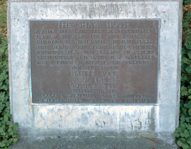 | Keywords: Ferndale CA Shaw House NSGW.jpg  en Photograph of historical marker at Main and Lewis Streets Ferndale California which reads The Shaw House - Pioneer Seth Louis Shaw began construction of his home Fern Dale in 1854 The town was named after his first permanent home The home in its original condition is a fine example of gothic architecture The house is a landmark and a source of pride to the community Dedicated by the Native Sons of the Golden West February 13 1982 Larry E Mowinckel Grand President In memory of James D Phelan U S Senator own photo Ellin Beltz 2012-10-26 40 34 43 7 N 124 15 42 18 W region US Plaques in Ferndale California Historical markers in Humboldt County California Taken with Panasonic Lumix DMC-FX12 Native Sons of the Golden WestPhotographs by Ellin Beltz |