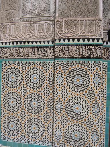 Keywords: Fes Medersa Bou Inania Mosaique2.jpg Fes Maroc <br> Medersa_Bou_Inania détail <br> Auteur Fabos 1/4/05 Bou Inania Madrasa Fes Zellige Plaster carvings in Islamic cultures Decorated walls Arabesque art Ornaments in Morocco