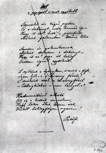 Keywords: Fetőfi Szerelem- és pipadal 1844 A.jpg Petőfi Sándor Szerelem- és pipadal c verse első változatának kézirata Az áthúzás feltehetően Császár Ferenctől származik Institution Petőfi Literary Museum Budapest Vargha Balázs szerk A Petőfi Irodalmi Múzeum Évkönyve 1959 p 144 http //muzeum arcanum hu/kiadvanyok Magyar Digitális Múzeumi Könyvtár 1844 Sándor Petőfi Pd-old Poems by Sándor Petőfi Collections of the Petőfi Literary Museum Budapest 1844 works in Hungary Poems in Hungarian Manuscripts by Sándor Petőfi |