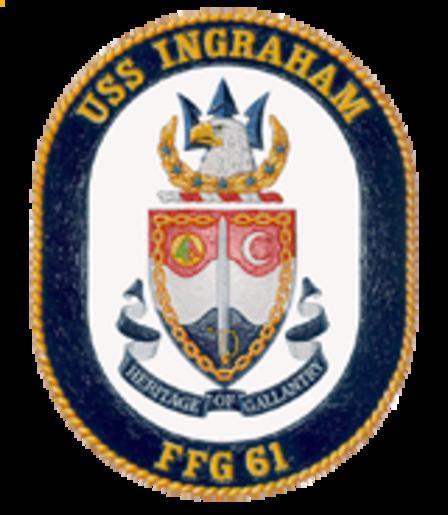 | Keywords: Ffg61 crest.gif en The Crest The eagle our national symbol portrays swiftness strength and constant vigilance The trident characterizes Naval weaponry and sea prowess and symbolizes the combat readiness and modern weapon systems of FFG 61 The seven stars commemorate the third INGRAHAM's service - four battle stars earned for World War II one for the Korean War and two for the Vietnam conflict The wreath of laurel is emblematic of excellence and accomplishment and also refers to the gold medal awarded to Captain Ingraham by Congress for his gallant and judicious conduct at Smyrna The Shield Dark blue and gold are the colors traditionally associated with the US Navy The chain broken by the sword represents Captain Duncan Ingraham forcing the release of Martin Koszto a Hungarian confined by an Austrian warship who had earlier declared his intention of becoming an American citizen The sword also emphasizes the Naval protection Captain Ingraham provided the Hungarian The color red symbolizes the courage it took for Ingraham to stand his ground alone far from his country The crescent adapted from the Turkish national flag refers to where the American Captain held fast and took a stand in 1853 The color white is expressive of his purity of intent The separations of the shield honor the three previous destroyers named INGRAHAM ; the wavy divisions reflect the sea The disc with three of the colors of the Navy Unit Commendation Award commemorates the award earned in World War II by the http //www ingraham navy mil/site 20pages/crest aspx Author PD-USGov-Military-Navy USS Ingraham FFG-61 United States Navy frigates emblems |