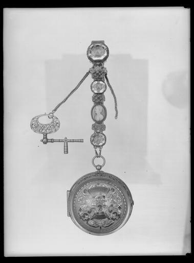 | Keywords: Fickur, J. Bellete, London 1700-1701 - Livrustkammaren - 77959.tif Fickur av guld s k montre à guichet titthålsur Tim- och minutangivelse sker genom två fasta visare och två svängda öppningar täckta av två blånerade och förgyllda skivor med signering BELLETE respektive LONDON Bakre verkbotten watch cock med graverad signatur två rader J Bellette // London Till höger liten tavla av silver med gradering 1-6 med kvarts- och halvtimmesmarkeringar Däröver en rund genombruten platta från överkanten till strax under mitten Därpå Karl XII s krönta namnchiffer omgivet på vardera sidan de svenska tre kronorna Längs kanten dedikation CAROLUS DUODECIMUS VIVAT FLOREAT TRIUMPHAT Nertill två sammanbundna palmkvistar förbundna med cirkelsegment till nederkanten Därpå rankverk och trofégrupp med antikt harnesk i mitten kanon fanor trumma mm <br/>På inre boetten engelska guldstämplar för 1700-1701 Leopard's head och Lion passant samt I W original caption Stölden på Livrustkammaren 1968 1701 gold - enamel size mm 57 m trycke size mm 48 size mm 32 g 121 LRK Statens historiska museum Wilhelm III av England Storbritannien kung 1650-1702 Haag Holland Ulrika Eleonora av Sverige Karl XII av Sverige Kunglig tid Kunglig tid 1999 Tidens Form Nationalmuseum 2008 C spegelmonogram Karl XII av Sverige I W anonym guld- och silversmed C spegelmonogram Karl XII av Sverige I W anonym guld- och silversmed place of origin London original filename LN_B06269_009149 55528 inventory number LRK 18993 77959 CC0 Fickur J Bellete London 1700-1701 - Livrustkammaren - 77959-negative tif <gallery caption Different images of same object > File Fickur J Bellete London 1700-1701 - Livrustkammaren - 26772 tif File Fickur J Bellete London 1700-1701 - Livrustkammaren - 915 tif </gallery> Media contributed by LSH unmatched event Media contributed by LSH dim-with multiple size templates Media contributed by LSH unmatched creator Media contributed by LSH unmatched objKeyword Pocket watches 18th-century watches Chatelaines Clock keys Media contributed by LSH 2013-10 wikipedia sv Ulrika Eleonora |