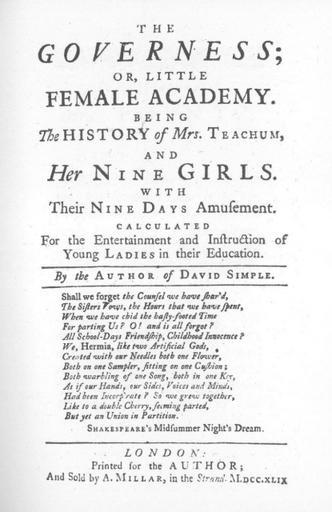 | Keywords: Fielding governess2.jpg Title page from The Governess 1749 edition by Sarah Fielding 1710-1768 The author died over 100 years ago http //en wikipedia org/wiki/File Fielding_governess2 jpg 1749 author PD-old-100 Title pages in English Children's book pages 1749 books Sarah Fielding Title pages from the United Kingdom Epigraphs in literature |