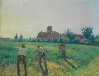 Keywords: Fienagione a San Fermo.jpg en Campaign glimpse In the background we see the apse of the church of San Fermo and some adjoining houses only partly hidden by trees and bushes The lower half is occupied by a large lawn in shades of green and yellow In the foreground three men with sickle to work one of which the rightmost one it is by grinding the blade it Scorcio di campagna Sullo sfondo si vede l'abside della chiesa di San Fermo ed alcune abitazioni annesse solo in parte nascoste da alberi e cespugli La metà inferiore è occupata da un grande prato nelle tonalità del verde e del giallo In primo piano tre uomini con falce al lavoro uno dei quali quello più a destra sta molando la lama http //www lombardiabeniculturali it/opere-arte/schede/A1020-00085/ view istituti hid 924 offset 49 sort sort_date_int Creator Archimede Bresciani 1933 PD-old-100 Archimede Bresciani |