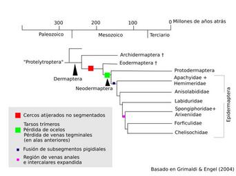 Keywords: File-DermapteraEvolES.svg es Ilustración de la filogenia del orden de insectos Dermaptera basada en Grimaldi Engel 2004 Evolution of the Insects Cambridge University Press 2016-01-27 https //commons wikimedia org/wiki/File DermapteraEvol svg https //commons wikimedia org/wiki/User Shyamal other versions cc-zero Dermaptera |