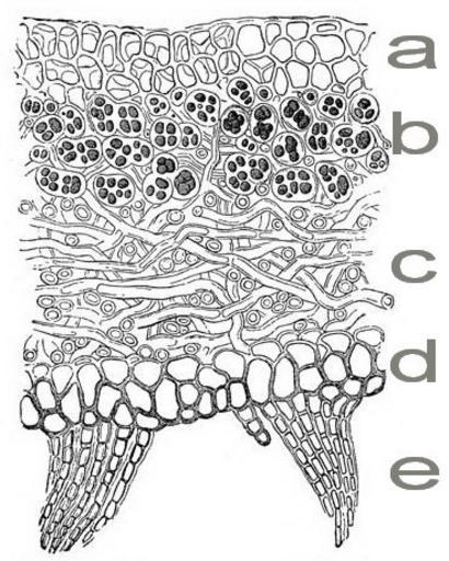 | Keywords: File-Meyers b6 s0351a.jpg Diagram of Sticta fuliginosa with layers a/b/c/d/e Bild von Sticta fuliginosa mit a/b/c/d/e Ст оение гете оме ного лишайника на п име е Sticta fuliginosa a - ко ковый слой b - гонидиальный слой c - се дцевина d - нижняя ко а e - изины Meyers b6 s0351 jpg - 1885 1890 author PD-Meyers Lichen anatomy and morphology Sticta fuliginosa Images from Meyers Konversationslexikon 4th edition - text figures Meyers b6 s0351 | ||||