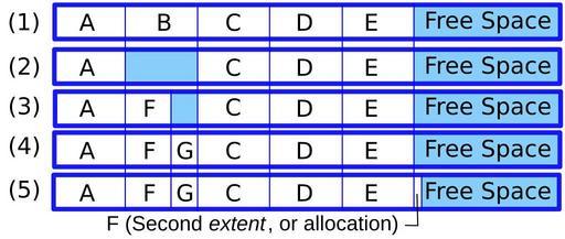 Keywords: File system fragmentation.svg Example of how file systems become fragmented The following is from the article of the same name on Wikipedia A blank disk has 5 files A B C D and E each using 10 blocks of space for this section a block is an allocation unit of that system it could be 1K 100K or 1 megabyte and is not any specific size On a blank disk all of these files will be allocated one after the other Example 1 on the image If file B is deleted there are two options leave the space for B empty and use it again later or compress all the files after B so that the empty space follows it This could be time consuming if there were hundreds or thousands of files which needed to be moved so in general the empty space is simply left there marked in a table as available for later use then used again as needed Example 2 on the image Now if a new file F is allocated 7 blocks of space it can be placed into the first 7 blocks of the space formerly holding the file B and the 3 blocks following it will remain available Example 3 on the image If another new file G is added and needs only three blocks it could then occupy the space after F and before C Example 4 on the image Now if subsequently F needs to be expanded since the space immediately following it is no longer available there are two options 1 add a new block somewhere else and indicate that F has a second extent or 2 move the file F to someplace else where it can be created as one contiguous file of the new larger size The latter operation may not be possible as the file may be larger than any one contiguous space available or the file conceivably could be so large the operation would take an undesirably long period of time thus the usual practice is simply to create an extent somewhere else and chain the new extent onto the old one Example 5 on the image Repeat this practice hundreds or thousands of times and eventually the file system has many free segments in many places and many files may be spread over many extents If as a result of free space fragmentation a newly created file or a file which has been extended has to be placed in a large number of extents access time for that file or for all files may become excessively long Rfc1394 File systems Megabyte |