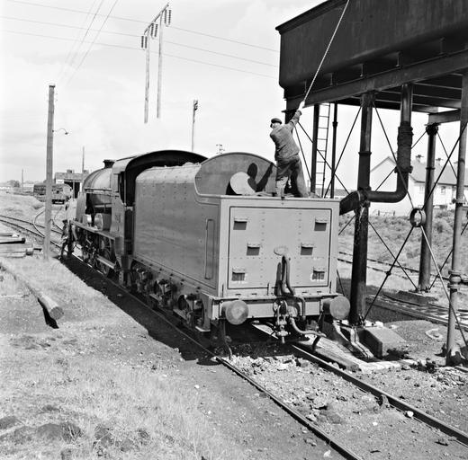| Keywords: 207 engine 207 engine207 conniberry laois ireland leinster tracks trains railways railroads c.i.é. cié coras iompair éireann corasiompairéireann railwaymen monday 24th april 1961 1960s sixties james p. o'dea jamespodea drumm railcars drummrailcars battery-powered batterypowered dr. drumm drdrumm great northern loco greatnorthernloco national library of ireland nationallibraryofireland o'dea photographic collection odeaphotographiccollection blackandwhite monochrome vehicle railroad outdoor train locomotive black and white This is engine 207 (aka Boyne) at Conniberry, Co. Laois. According to our catalogue, this picture was taken while 207 was "getting coal supplies". However, the consensus from comments below is that it is water that's being taken on, so I'll change the description in our catalogue... Thanks to a link provided by blackpoolbeach, we now know this engine was blue! Date: Monday, 24 April 1961 NLI Ref.: ODEA 25/44 This is engine 207 (aka Boyne) at Conniberry, Co. Laois. According to our catalogue, this picture was taken while 207 was "getting coal supplies". However, the consensus from comments below is that it is water that's being taken on, so I'll change the description in our catalogue... Thanks to a link provided by blackpoolbeach, we now know this engine was blue! Date: Monday, 24 April 1961 NLI Ref.: ODEA 25/44 |