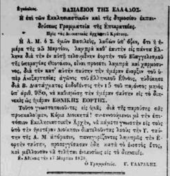 | Keywords: FIMI newspaper No106 19March1838 p2.jpg  en Cropped part from the last page of the Athenian newspaper FIMI - ΦΗ Η 19 March 1838 issue 106 showing the decree of Minister Glarakis concerning the celebration of the 25th March as a National holiday commemorating the beginning of the Greek war for independence 1821 el  έρος της τελευταίας σελίδας της Αθηναϊκής εφημερίδας ΦΗ Η 19  αρτίου 1838 Φύλλο 106 Έτος Β'  ου  εριέχει εγκύκλιο του γραμματέα Υ ουργού Εκκλησιαστικών ε ί της δημοσίου εκ αιδεύσεως γραμματεία της ε ικράτειας Γ Γλαράκη  ρος τας διοικητικάς αρχάς του κράτους σχετικά με την καθιέρωση της 25ης  αρτίου ως Εθνική Εορτή για την έναρξη του Αγώνα Ανεξαρτησίας του Ελληνικού Έθνους της Ε ανάστασης του 1821 http //srv-web1 parliament gr/display_doc asp item 32923 seg 208 Newspaper FIMI 1838-03-19 PD-old Newspapers of Greece Greek War of Independence |