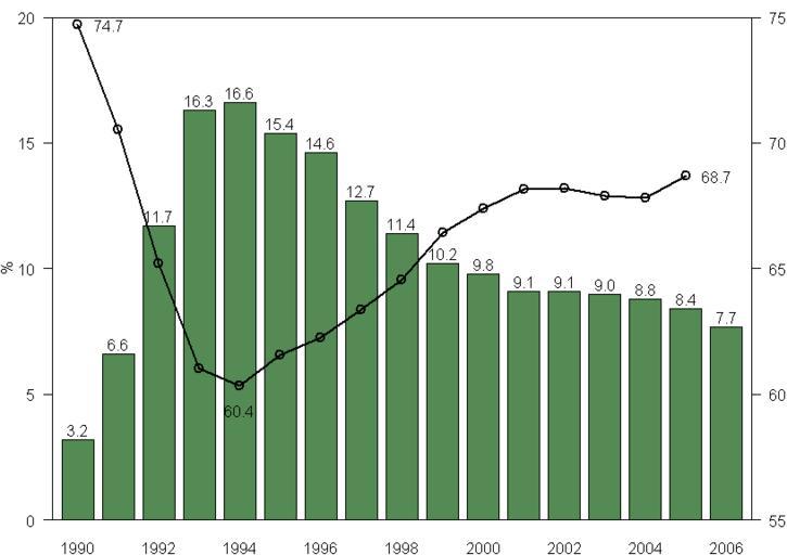 Keywords: Fin unemployment 90 06.png Finnish unemployment rate left axis bars and employment rate right axis line between 1990 and 2006 Labour Force Survey Suomen työttömyysaste vasen asteikko pylväät ja työllisyysaste oikea viiva vuosina 1990 - 2006 työvoimatutkimus Data from http //www mol fi/mol/fi/99_pdf/fi/06_tyoministerio/06_julkaisut/aikakausi/tak/2006/00/Taulukot pdf Ministry of Labour Työpoliittinen aikakauskirja tables graph own work 2007-03-06 Jkv PD-Own R source u <- c 3 2 6 6 11 7 16 3 16 6 15 4 14 6 12 7 11 4 10 2 9 8 9 1 9 1 9 0 8 8 8 4 7 7 p <-c 3737 3761 3784 3802 3825 3839 3850 3862 3878 3890 3901 3909 3918 3926 3935 3948 -c 385 394 401 409 422 430 434 437 437 435 436 437 439 442 447 452 e <- c 2504 2375 2206 2071 2054 2099 2127 2170 2222 2296 2335 2367 2372 2365 2365 2401 png fin_unemployment_90_06 png width 480 1 7 height 480 1 2 par mar c 2 3 1 2 las 1 mgp c 2 2 1 0 x <- barplot u names arg 1990 2006 col palegreen4 space 3 ylim c 0 20 ylab xaxs r xlim c 8 21 6 text x u+ 4 format u T lines x-17 100 e/p-55 lwd 2 points x-17 100 e/p-55 lwd 2 cex 1 5 pch 1 axis 4 seq 0 20 5 seq 55 75 5 text c x1+1 x5 x16+1 c 100 e/p-55 c 1 5 16 +c 0 -1 0 format c 100 e/p c 1 5 16 T di 3 box dev off Created with R Unemployment in Finland Economy of Finland |