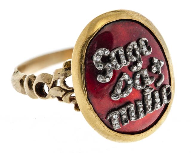 | Keywords: Fingerring av guld med skrift i rosenstenar på röd emalj, 1700-tal - Hallwylska museet - 110206.tif LSH artwork sv FINGERRING Av guld med emalj och rosenstenar Skena smal utvidgad uppåt på vadera sidan samt med ändarna tvådelade och förgrenade insidan platt slät på utsidan längs nedre delen en skarp rygg medutvidgade ändar samt mellan två smala kantstavar Mellan skenans ändar en tvärliggande oval skiva med konvex översida i röd emalj pålagd Gärd af vänskap orden besatta med tillsammans sextiotvå rosenstenar i fattningar av silver Utan stämplar Skiva höjd 1 7 cm bredd 1 4 cm Tyskt arbete från 1700-talets mitt Inköpt av Wilhelmina von Hallwyl december 1899 hos antikvitetshandlare Ed Kahlert Tyskland original caption Fingerring av guld med skrift i rosenstenar på röd emalj 1700-tal <br/> Nyckelord Emalj Rosenstenar Ring Fingerring Föremålsbild Guld Bokstäver mid other date century 18 gold - enamel g 5 5 size cm 2 1 HWY place of origin DE original filename hm_dig24295 19426 inventory number HWY XXXVI C a 48 110206 CC-BY-SA Helena Bonnevier Finger rings Letters Enamel Gold Diamond jewellery Jewellery in the Hallwyl museum Helena Bonnevier Media contributed by LSH unmatched material Media contributed by LSH 2016-12 18th-century jewellery |