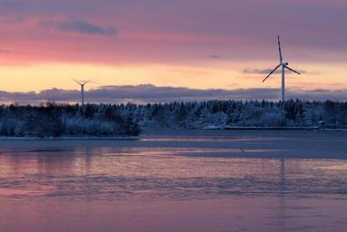 Keywords: finland windmills energy landscape scenic sky clouds river frozen snow ice reflections sunset nature outside countryside rural