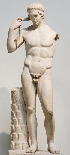 | Keywords: Farnese Diadumenos BM 501.jpg after So-called Farnese Diadumenos Diadumène Farnèse Athlete tying the victor's ribbon around his head Marble Roman copy after a Greek bronze original The subject is similar to that of Polykleitos but varies slightly in stance Athlète nouant le bandeau de la victoire Copie romaine du Ier siècle ap J -C d'après un original en bronze Le sujet est le même que celui de Polyclète mais la pose varie légèrement Atleta che si cinge il capo con la benda della vittoria Copia romana da un originale greco Il soggetto è simile a quello di Policleto ma differisce leggermente nella posa ca 440 BC original ; century 1 AD copy marble white cm 145 Museum British Museum Main floor room 23 Greek Rome object history credit line Farnese Collection ProvenanceEvent purchase Ferdinand II of the Two Sicilies 1864 accession number GR 1864 10-21 4 Cat Sculptures 501 Marie-Lan Nguyen 2006 other versions Farnese Diadoumenos British Museum |