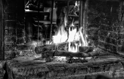Keywords: fire glowing heat flame burn wood fire black and white s w