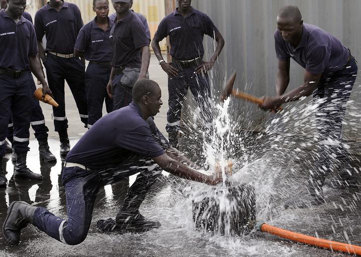 Keywords: firefighters training stopping leak plugging hole exercise emergency hose drill equipment damage control dakar fire department marine terminal