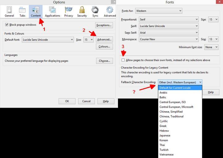 | Keywords: Firefox 31 options content advanced uncheck allow pages to choose their own fonts annotated.png en The advanced font options in Mozilla Firefox version 31 0 under an English language Windows 8 operating system created to show the details of the Fallback Character Encoding drop down menu The red arrows numbered one to three indicate the sequence of mouse clicks the user needs to perform to make Firefox display the user's choice of fonts and not the web page's choice The arrow annotated with a question mark indicates the drop down menu choices for legacy web pages screenshot of Firefox 31 0 by 84user 2014-09-01 Mozilla Foundation and 84user <span class signature-talk >talk</span> MTL my modifications only Screenshots of Mozilla Firefox 31 x |