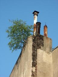 Keywords: fireplace chimney stainless roof facade sky roof ridge edges blue city tree birch