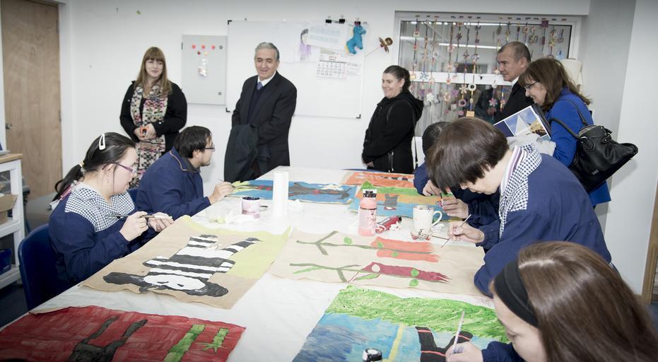 | Keywords: indoor La firma de convenio entre UMAG y la Corporación Manos de Hermanos se realizó el día Martes 7 de Abril de 2015 en el Centro Laboral de la Corporación ubicado en la Calle Cirujano Videla # 34. El objetivo de este convenio es que los alumnos de UMAG puedan realizar prácticas profesionales en este centro laboral. La corporación Manos de Hermanos acoge a adultos con capacidades diferentes entre 26 y 50 años, les entrega herramientas para su autonomía, en el ámbito de creatividad artística, mejora de la motricidad, cocina y aseo. Manos de Hermanos es una corporación privada sin fines de lucro, que se financia mediante proyectos del gobierno regional, además de aportes voluntarios de privados. En la Foto (de izq a der): Dr. Juan Oyarzo (Rector UMAG) junto a autoridades de UMAG visitan Taller de Creación Artística La firma de convenio entre UMAG y la Corporación Manos de Hermanos se realizó el día Martes 7 de Abril de 2015 en el Centro Laboral de la Corporación ubicado en la Calle Cirujano Videla # 34. El objetivo de este convenio es que los alumnos de UMAG puedan realizar prácticas profesionales en este centro laboral. La corporación Manos de Hermanos acoge a adultos con capacidades diferentes entre 26 y 50 años, les entrega herramientas para su autonomía, en el ámbito de creatividad artística, mejora de la motricidad, cocina y aseo. Manos de Hermanos es una corporación privada sin fines de lucro, que se financia mediante proyectos del gobierno regional, además de aportes voluntarios de privados. En la Foto (de izq a der): Dr. Juan Oyarzo (Rector UMAG) junto a autoridades de UMAG visitan Taller de Creación Artística |