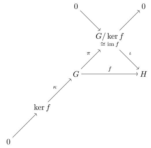 Keywords: First-isomorphism-theorem.svg Commutative diagram showing the first isomorphism theorem Created as per en meta Help Displaying a formula Commutative diagrams <pre> \documentclass amsart \usepackageall ps dvips xy Loading the XY-Pic package Using postscript driver for smoother curves \usepackage color For invisible frame \begin document \newcommand \im \operatorname im \newcommand \stack 2 \genfrac 0pt 1 2 \newcommand \stack 2 \underset 2 1 \thispagestyle empty No page numbers \SelectTips eu Euler arrowheads tips \setlength \fboxsep 0pt Frame box margin \color white \framebox \color black Frame for margin \xymatrix 1pt We want equal spacing and the entries close together 0 \ardr 0\\ \stack G / \ker f \cong\;\im f \arur \ardr \iota \\ G \arrr f \arur \pi H\\ \ker f \arur \kappa \\ 0\arur end math end frame \end document </pre> 2008-11-13 Michael K Edwards Commutative diagrams Xy-pic diagrams Images with LaTeX source code |