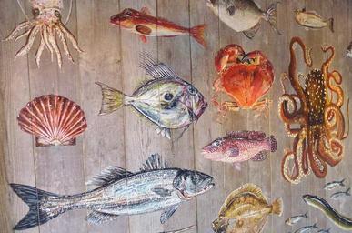 Keywords: fish sea animals meeresbewohner water creature underwater world animals colorful creature maritime animal world coast travel shellfish shell octopus octopuss fauna drawing painting mural art paint artwork wooden boards painted colored