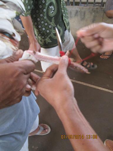Keywords: 'Fitting the tare-knife onto the battle cocks leg'.JPG en A razor sharp dagger tied to the battle-cock own Rudolph A furtado Monday 1-9-2014 Cockfighting in Bali Cc-zero