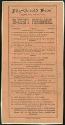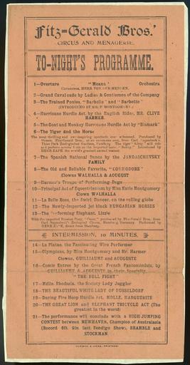 | Keywords: document text Programme includes items by the orchestra conducted by Herr von der Merden, trained ponies Barbelle and Barbette (introduced by Mr P Montgomery), hurdling by English rider Mr Clive Harmer, tiger riding a horse (introduced by Herr Zape), the Spanish national dance by the Jandaschevsky family, clowns Walhalla & Aougust [sic], Harmer's performing dogs, La Belle Rose (swirl dancer), Hungarian horses, Lizzie the performing elephant, La Platae (wire performer), clowns Guillaume and Aouguste [sic], Mlle Rhodesia (juggler), the Beautiful White Lady of Dusseldorf, daring fire hoop hurdle act by Mlle Marguerite, high jumping contest between Newhaven (high jump champion of Australasia, record 6ft 9in), Bramble and Stockman. Quantity: 1 b&w art print(s). Physical Description: Letterpress on orange paper, 287 x 143 mm. Provenance: Donated by Mrs Beatrice Cabot, widow of Charles Cabot, in 1978. Harman & Jacka (Firm). Fitzgerald Bros Circus and Menagerie :Fitz-gerald Bros.' circus and menagerie. To-night's programme. Harman & Jacka, printers [Adelaide. 1910s?]. Ref: Eph-B-CABOT-Circus-Fitzgerald-01. Alexander Turnbull Library, Wellington, New Zealand. natlib.govt.nz/records/22315418 Programme includes items by the orchestra conducted by Herr von der Merden, trained ponies Barbelle and Barbette (introduced by Mr P Montgomery), hurdling by English rider Mr Clive Harmer, tiger riding a horse (introduced by Herr Zape), the Spanish national dance by the Jandaschevsky family, clowns Walhalla & Aougust [sic], Harmer's performing dogs, La Belle Rose (swirl dancer), Hungarian horses, Lizzie the performing elephant, La Platae (wire performer), clowns Guillaume and Aouguste [sic], Mlle Rhodesia (juggler), the Beautiful White Lady of Dusseldorf, daring fire hoop hurdle act by Mlle Marguerite, high jumping contest between Newhaven (high jump champion of Australasia, record 6ft 9in), Bramble and Stockman. Quantity: 1 b&w art print(s). Physical Description: Letterpress on orange paper, 287 x 143 mm. Provenance: Donated by Mrs Beatrice Cabot, widow of Charles Cabot, in 1978. Harman & Jacka (Firm). Fitzgerald Bros Circus and Menagerie :Fitz-gerald Bros.' circus and menagerie. To-night's programme. Harman & Jacka, printers [Adelaide. 1910s?]. Ref: Eph-B-CABOT-Circus-Fitzgerald-01. Alexander Turnbull Library, Wellington, New Zealand. natlib.govt.nz/records/22315418 |