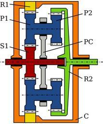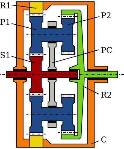 | Keywords: Fixed Diff C.svg A fixed differential gear system This arrangement has a typical ratio of between 20 1 and 500 1 The ratio is given by <math>m_G \left \frac N_ R1 N_ S1 +1\right \frac N_ R2 N_ P1 N_ R2 N_ P1 -N_ R1 N_ P2 </math> where <math>N_ S1 </math> is the number of teeth on the No 1 Sun gear S1 red <math>N_ R1 </math> is the number of teeth on the No 1 Ring gear R1 yellow <math>N_ R2 </math> is the number of teeth on the No 2 Ring gear R2 green <math>N_ P1 </math> is the number of teeth on the No 1 Planet gear P1 dark blue on the left <math>N_ S2 </math> is the number of teeth on the No 2 Planet gear P2 dark blue on the right The fixed member is the No 1 Ring the input member is the Sun S1 red and the output member is the No 2 Ring self-made Inkscape 2008-03-18 Inductiveload Differential gear systems Drawings of gears and gearboxes Planetary gearing Transmissions SVG machinery |