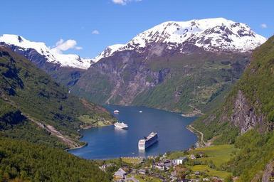 Keywords: fjord norway fjordlandschaft mountains landscape nature hill sky summit spring holiday north clear air blue sky white clouds blue cold white water recovery fish geirangerfjord ship shipping cruise