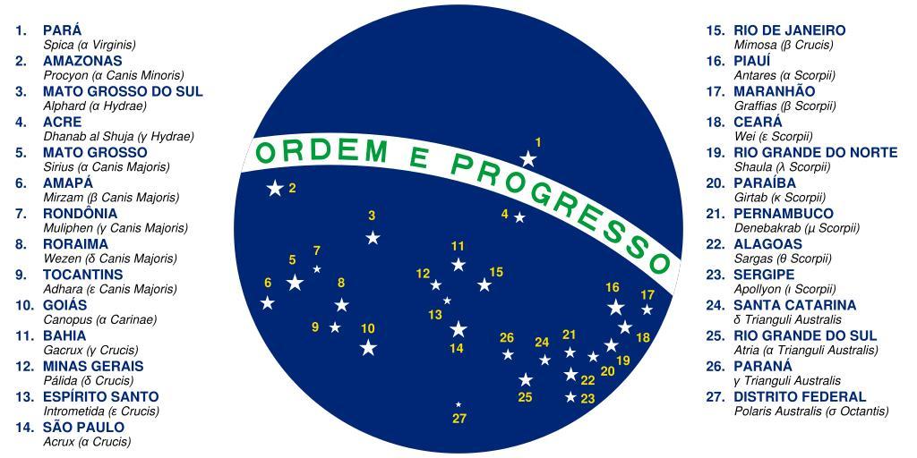 Keywords: Flag of Brazil (sphere).svg The stars in the flag of Brazil according to Federal Law 8421 of May 11th 1992 http //www planalto gov br/ccivil_03/Leis/1989_1994/anexo/ANL8421-92 pdf 2007-02-22 Tonyjeff based on national symbol PD-BrazilGov Flag construction sheets of Brazil insignia |
