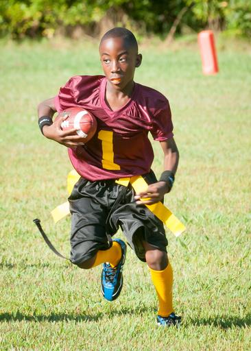 Keywords: flag football football flag sport game competition communication ball touchdown winning team match player children kids running black