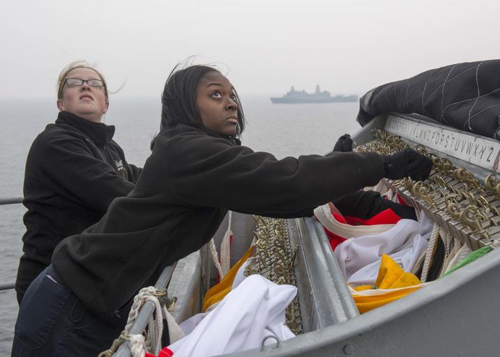 Keywords: Flag hoisting drill 160313-N-GZ228-021.jpg en 160313-N-GZ228-021 EAST SEA March 13 2016 Quartermaster Seaman Kaitlynn Barton left and Quartermaster 2nd Class Kahzia Johnson-Baker prepare signal flags during a flag hoisting drill with amphibious transport dock ship USS New Orleans LPD 18 aboard amphibious assault ship USS Boxer LHD 4 Boxer is the flagship of the Boxer Amphibious Ready Group and is participating in Exercise Ssang Yong 16 Ssang Yong is a biennial combined amphibious exercise conducted by forward-deployed U S forces with the Republic of Korea Navy and Marine Corps Australian Army and Royal New Zealand Army Forces in order to strengthen our interoperability and working relationships across a wide range of military operations - from disaster relief to complex expeditionary operations U S Navy photo by Mass Communication Specialist 3rd Class Jesse Monford/Released <br>Unit Navy Media Content Services 2016-03-13 Jesse Monford https //www dvidshub net/image/2462833/flag-hoisting-drill 160313-N-GZ228-021 2016-03-15 00 03 EAST SEA USS BOXER AT SEA PD-USGov-Military-Navy USS Boxer LHD-4 USS New Orleans LPD-18 Images from DoD uploaded by Fæ |
