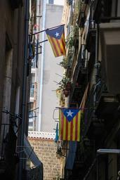 Keywords: flags catalonia homes barcelona spain facade narrow street apartments building balcony