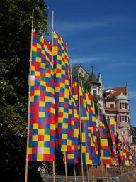 Keywords: flags colorful blow wind flutter blue red yellow danube fixed ulm