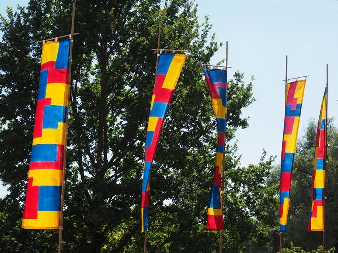 Keywords: flags colorful blow wind flutter blue red yellow danube fixed ulm