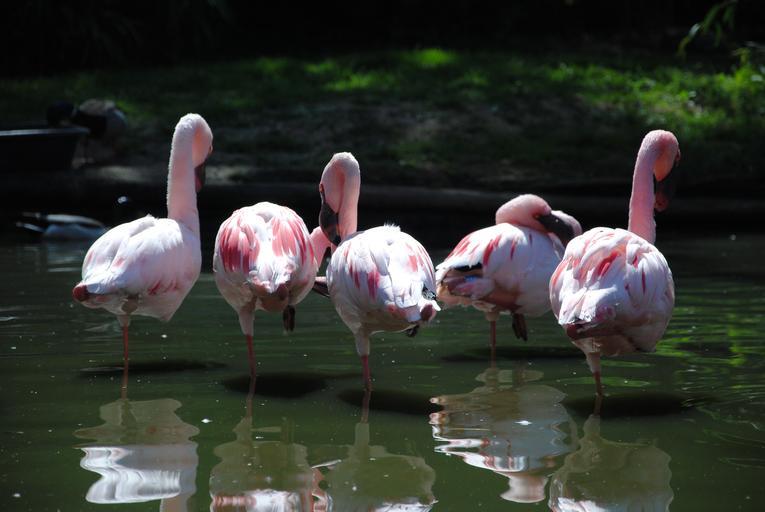 Keywords: flamingo bird water legs red pink tropical nature zoo wild animal wildlife exotic fauna feather colorful group