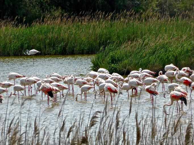 Keywords: flamingos lake wildlife group flock pink plumage animals nature species