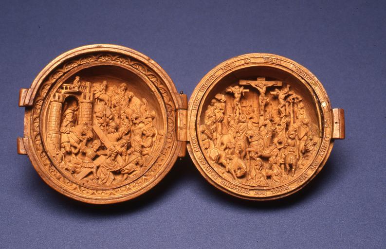 Keywords: Flemish - Rosary Bead with Scene of Christ Carrying the Cross - Walters 61131.jpg The rosary a string of beads used by Catholics as an aid in reciting specific prayers was an important tool for practicing personal private devotion Many highly crafted rosaries featured an additional pendant for which ivory and boxwood were popular materials because they could be so intricately carved Here the filigree resembles the tracery in late-Gothic church windows This bead opens to reveal scenes of Christ Carrying the Cross and the Crucifixion Even after the style was no longer in fashion and a rosary with this kind of pendant had been replaced as an aide to devotion by a more up-to-date rosary these pendants continued to be valued for the virtuosity of the carving on such a tiny scale between 1500 1525 Renaissance boxwood cm 4 9 diam accession number 61 131 25101 Henry Walters Baltimore date and mode of acquisition unknown Walters Art Museum Henry Walters Acquired by Henry Walters World of Wonder The Walters Art Gallery Baltimore 1971-1972 place of origin Belgium Walters Art Museum license Renaissance applied arts in the Walters Art Museum Flemish art in the Walters Art Museum Christian rosaries 16th-century wood carving Carved wooden objects Prayer nuts |