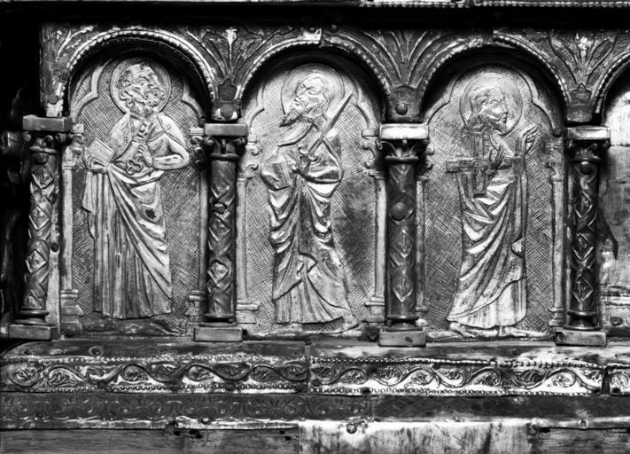 | Keywords: Flemish - Shrine of Saint Amandus - Walters 539 - Detail A.jpg This large church-shaped shrine once housed the relics of a 7th-century saint who served as a missionary and bishop to the western regions of present-day Belgium St Amandus d 679 also established a monastery at Elnon near Tournai western Belgium where the monks later commissioned this reliquary to honor his remains The shrine of St Amandus ornamented with silver columns and gilded apostles was the focus of a strong local cult visited by pilgrims who came for healing or in thanks for prayers answered Given its large size and popularity the shrine was probably placed upon a platform supported by columns behind the main altar for year-round veneration early 13th century with later additions Medieval wood oak gilded copper silver brass champlevé enamel cloisonné enamel rock crystal and semiprecious stones H at top of finials 19 1/4 x W 25 1/4 x D 11 15/16 in 48 9 x 64 14 x 30 32 cm accession number 53 9 22284 Brimo de Laroussilhe Paris date and mode of acquisition unknown Henri Daguerre Paris date and mode of acquisition unknown Henry Walters Baltimore September 3 1930 by purchase Walters Art Museum Henry Walters Acquired by Henry Walters 1930 Transcription In black enamel on gilt copper strips placed along the base of the roof-like lid IN ISTA CAPSA SVNT SEQVENTES RELIQ VIA E B EATI AMANDI EP ISCOPU S; Translation In this reliquary are the following relics of the blessed Bishop Amandus; Transcription In black enamel on gilt copper strip placed along the base of the roof-like lid PROESENTIS COMPOSITIVS Reliquaries and Ritual Medieval Objects of Devotion The Walters Art Gallery Baltimore 1984-1985 The Book of Kings Art War and the Morgan Library's Medieval Picture Bible The Walters Art Museum Baltimore; Academy of the Arts Easton Easton; Princeton University Art Museum Princeton; The Mitchell Gallery Annapolis; Williams College Museum of Art Williamstown 2002 The Special Dead A Medieval Reliquary Revealed The Walters Art Museum Baltimore 2008-2009 Treasures of Heaven The Cleveland Museum of Art Cleveland; The Walters Art Museum Baltimore; The British Museum London 2010-2011 place of origin Elnone Monastery in Tournai Belgium Walters Art Museum license Reliquary chest of Saint Amand Media contributed by the Walters Art Museum needs category review |