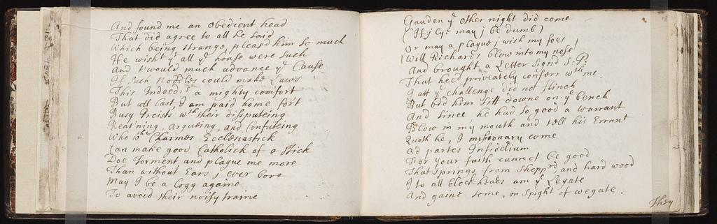 | Keywords: Flickr - Beinecke Flickr Laboratory - (Commonplace Book), (late 17th Century) (19).jpg Anonymous MS collection of poems and recipes The compiler was evidently a member of Cambridge University Collection includes bawdy and satirical verse mainly of a political anti-Popery and academic cast 88 p and 74 p of medical cookery and household recipes beginning with 2 p of directions for anglers Page/Caption 17v-18r late 17th century 1 volume 168 p 10 x 16 cm Subjects English poetry Latin poetry Cookery Medicine Fishing Genre Commonplace books Manuscripts Poems Cite as James Marshall and Marie-Louise Osborn Collection Beinecke Rare Book and Manuscript Library Yale University Repository http //www library yale edu/beinecke Beinecke Rare Book Manuscript Library Yale University Bibliographic Record Number 2031703 Call Number Osborn b115 http //www flickr com/photos/25923731 N05/2436049913/ Commonplace Book late 17th Century 2008-04-23 08 52 http //www flickr com/people/25923731 N05 Beinecke Flickr Laboratory PD-old Osborn b115 Beinecke Library |