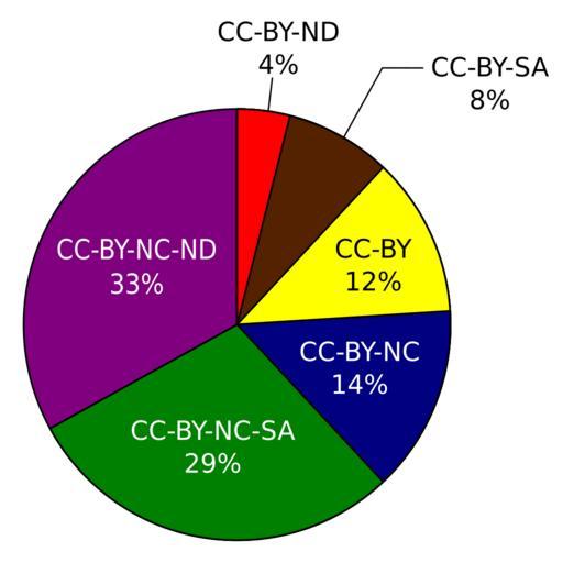 | Keywords: Flickr Licenses edit.svg en A breakdown of the different types of CC licenses used on Flickr Own Acablue 2009-07-10 File Flickr license types svg SVG pie charts Flickr ImageNote 1 257 106 138 171 500 500 2 Only 20 of Flickr works are usable on Wikimedia Commons ImageNoteEnd 1 ImageNote 2 13 85 197 301 500 500 2 The most popular license is sadly the most restrictive ImageNoteEnd 2 ImageNote 3 25 287 395 196 500 500 2 These works are not Free Cultural Works ImageNoteEnd 3 | ||||