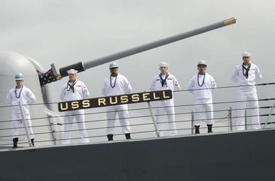 Keywords: Flickr - Official U.S. Navy Imagery - USS Russell arrives at Joint Base Pearl Harbor-Hickam..jpg JOINT BASE PEARL HARBOR-HICKAM April 23 2012 Sailors man the rails of the guided-missile destroyer USS Russell DDG 59 as the ship arrives at Joint Base Pearl Harbor-Hickam following completion of an eight-month deployment to the western Pacific and Arabian Gulf Russell and her crew of nearly 300 Sailors conducted a wide range of operations including ballistic missile defense maritime security operations and oil platform defense Additionally the ship and her crew participated in multi-national exercises with NATO allies and Gulf partner nations in support of theater security cooperation and operations U S Navy photo by Mass Communication Specialist 2nd Class Mark Logico/Released 120423-N-WP746-058 Join the conversation http //www facebook com/USNavy www facebook com/USNavy http //www twitter com/USNavy www twitter com/USNavy http //navylive dodlive mil navylive dodlive mil http //www flickr com/photos/usnavy/6967254108/ USS Russell arrives at Joint Base Pearl Harbor-Hickam 2012-04-23 11 08 http //www flickr com/people/56594044 N06 Official Navy Page from United States of America Mark Logico/U S Navy U S Navy photo PD-USGov-Military-Navy Official U S Navy Imagery http //flickr com/photos/56594044 N06/6967254108 2012-11-13 18 51 00 cc-by-2 0 Images from United States Navy to check |