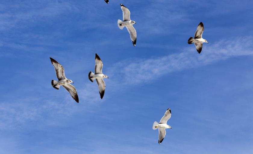 Keywords: flock sea gulls wildlife sky flight outdoor blue gull flying seagull bird wings fly soar freedom soaring high feather